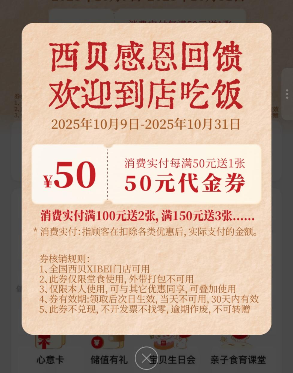 10月9日,西贝再次发放代金券,宣布2025年10月9日—2025年10月31日,消费实付每满50元送1张50元代金券、消费实付满100元送2张、满150元送3张。代金券全国西贝XIBEI门店可用,限堂食,30天内有效。